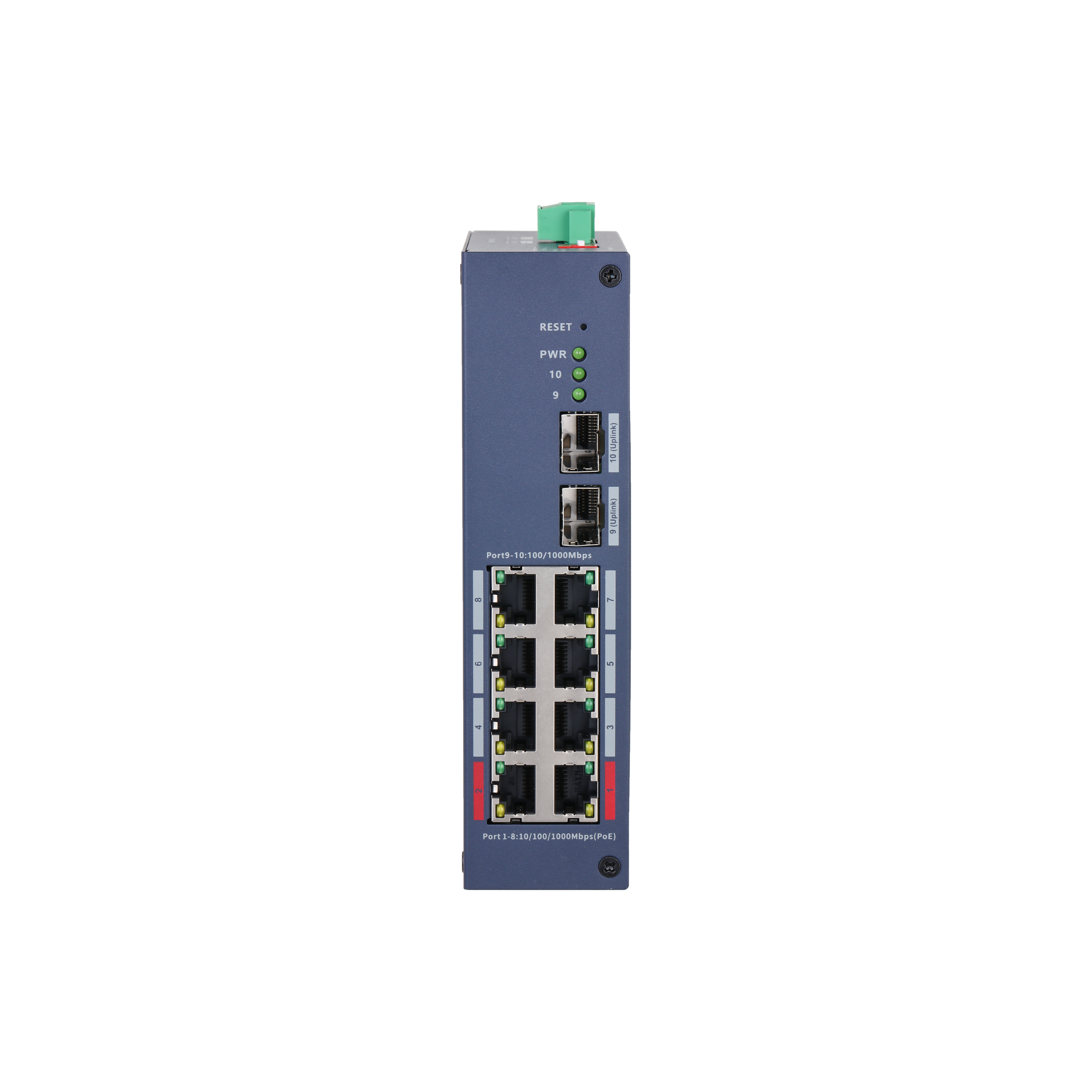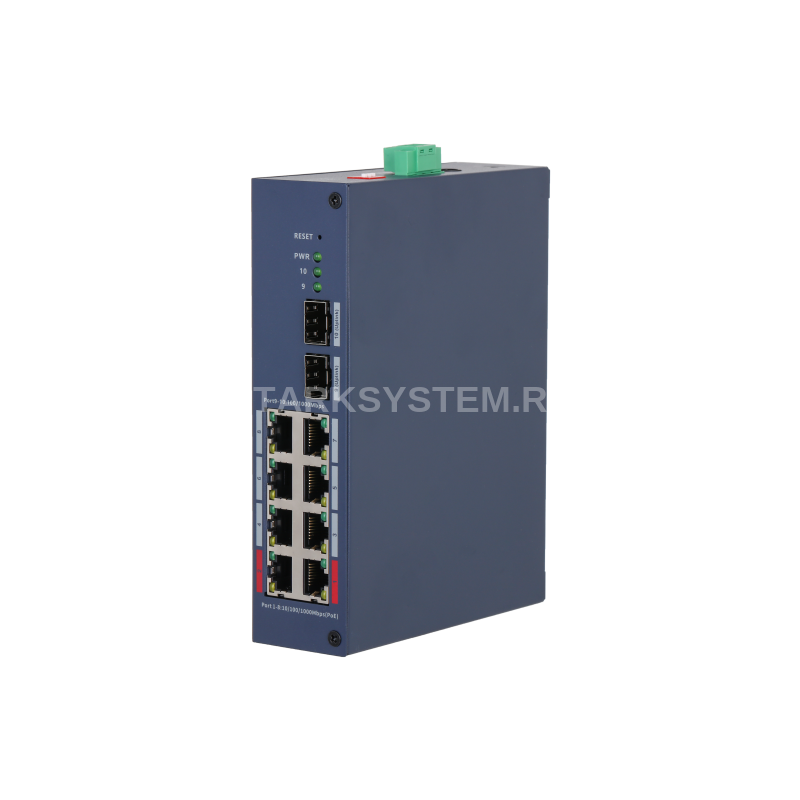 Порт 1–8: 8 × RJ-45 10/100/1000 Мбит/с (PoE) Порт 9–10: 2 × SFP 100/1000 Мбит/с (восходящий канал) |