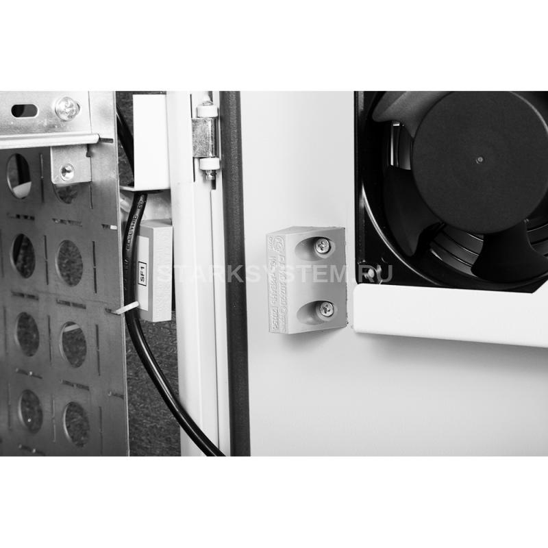 Изделие в климатическом исполнении У2 по ГОСТ 15150–69 предназначено для уличной эксплуатации при температуре от минус 50 до 45 °С и относительной влажности воздуха не более 80 % при 20 °С. Шкаф крепится на стену при помощи четырёх уголков (анкеры не входят в комплект поставки), при необходимости можно применить крепление на столб (не входит в комплект поставки). В основании шкафа ЦМО ШТВ-Н-15.6.3-4ААА-Т2 предусмотрены съёмные заглушки для ввода кабелей. Конструкция заглушек предполагает разное количество и диаметр отверстий для установки кабельных вводов по желанию заказчика. (В комплект изделия входит один кабельный ввод для подключения питания шкафа). Для крепления на столб необходимо докупить комплект крепления на столб EMW-KKC-600. Питание изделия осуществляется от внешней электрической сети напряжением 220 В переменного тока частотой 50 Гц. Изделие имеет степень защиты от поражения электрическим током класса I по ГОСТ IEC 61140-2012 и соответствует ГОСТ 12.2.027.0-75. Допустимая распределённая статическая нагрузка до 150 кг. Корпус шкафов ЦМО ШТВ-Н-15.6.3-4ААА-Т2 имеет металлическую сварную конструкцию, внутри покрыт слоем утеплителя с фольгированным покрытием, что улучшает термоизоляцию и уменьшает теплопотери через стенки шкафа. В комплект шкафа входят задняя оцинкованная панель и комплект вертикальных юнитовых панелей. Двери шкафов ЦМО ШТВ-Н-15.6.3-4ААА-Т2 имеют перфорацию, которая обеспечивает вентиляцию установленного в них оборудования, но при этом исключает прямой доступ в полость шкафа и попадание в него инородных предметов. В дверь встроена система вентиляции, состоящая из модуля вентиляторного (только в комплектации Т1) и фильтра. Максимальный угол открытия двери шкафа 120°. На кронштейне, расположенном на верхней петле двери, находится датчик открытия дверей. Перечень установленного оборудования:- Вентилятор (комплектация Т1)