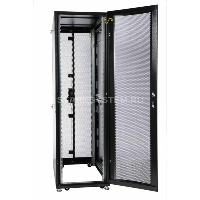 Шкаф ЦМО ШТК-СП-48.8.12-44АА-9005 поставляется в собранном виде. Две массивные сварные рамы соединенные комплектом швеллеров обеспечивают повышенную жесткость конструкции. Верхняя часть шкафа блокируется панелью с кабельными вводами, нижняя полая, подготовлена для установки панелей различного назначения. Шкаф оптимизирован для размещения серверного оборудования, имеет повышенную статическую нагрузочную способность до 1350 кг. ШТК-С Проф стандартно комплектуется одинарными или двойными дверями с увеличенной площадью перфорации в 63%. Двери надежно фиксируются усиленными точечными замками. Одинарные двери имеют как правую, так и левую навеску, угол открывания - 180 градусов. Боковые проемы блокируются двойными стенками разделенными по горизонтали. Стенки фиксируются защелками и точечными замками. Шкаф поставляется с четырьмя вертикальными направляющими для установки оборудования. Тыльная часть стандартно комплектуется двумя вертикальными органайзерами. Доступ для монтажа, коммутации и обслуживания возможен с четырех сторон, через боковые горизонтальные стенки, переднюю и заднюю двери. Шкаф имеет 4 оцинкованные вертикальные направляющие, с удобной регулировкой по глубине. Крыша имеет четыре кабельных воода – 100х130мм. в шкафах шириной 600мм. и 300х130 в шкафах 800мм. Кабельные вводы закрыты панелями. Предусмотрено крепление кабельных каналов к крыше шкафа фиксаторами серии КГЛ. Нижняя часть шкафа - полая, обеспечивает хороший доступ к коммуникациям в подготовленном помещении. В основание шкафа также предусмотрена установка панелей различного назначения. Тыльная часть шкафа стандартно комплектуется вертикальными кабельными органайзерами шириной 100 мм, перфорированными для удобного размещения блоков розеток, укладки и фиксации коммутационного кабеля. В основание шкафа установлены винтовые опоры (ножки) и транспортировочные ролики. Предусмотрено крепление основания шкафа к полу. Шкаф имеет контур заземления, дополнительно (в комплектацию не входит) можно приобрести панель заземления длиной 500 мм или 1000 мм. Конструкция шкафа оптимизирована для легкой установки серверного оборудования и поддержания максимального воздушного потока. Для организации линейной установки предусмотрено удобное крепление шкафов между собой. Перфорированные двери имеют округлую форму, что увеличивает площадь перфорации. Вертикальные направляющие имеют упрощенную регулировку по глубине. Основание шкафа полое. Вертикальные кабельные органайзеры входят в стандартную комплектацию шкафа, предусмотрена возможность вертикальной установки четырех 19’’ блоков розеток на каждый органайзер, возможна установка блоков розеток на горизонтальные соединительные швеллеры и вертикальные (юнитовые) направляющие. Шкаф поставляется в собранном виде на поддоне высотой 150мм. Цвет (порошковая покраска с предварительным фосфатированием) – RAL 9005 черный. Производитель имеет право вносить изменения в конструкцию изделия без ухудшения его функциональных характеристик. Шкаф ЦМО ШТК-СП-48.8.12-44АА-9005 выполнен в соответствии с требованиями стандарта IEC 60 297 "Конструкции механические серии 482,6 (19 дюймов).Технические характеристики ЦМО ШТК-СП-48.8.12-44АА-9005