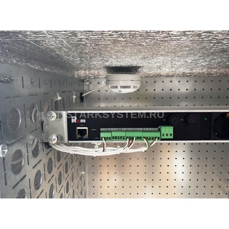 Система мониторинга включает установленные в шкафу контроллер Rem-MC1 со встроенным датчиком удара, датчик открытия двери, цифровой датчик влажности и температуры RS-HT1, датчик дыма, датчик протечки. Цифровой модуль Rem-MC-DMTH поддерживает заданную температуру и влажность в установленных параметрах круглый год, а также для обеспечения работы подключаемого активного оборудования в заданном диапазоне температуры и влажности предусматриваются функции "холодного" и "горячего" старта, по предельным значениям температуры и "влажного старта" по предельному значению влажности.