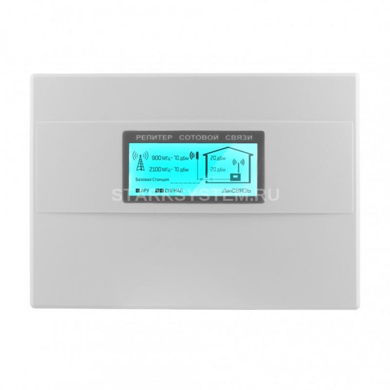 ДалСВЯЗЬ DS-900/2100-20 - двухдиапазонный репитер усиливает сигнал сотовой связи операторов MTC, МегаФон, Теле2 и Билайн в стандартах 2G GSM900, 3G UMTS900, 3G UMTS2100. В комплекте с усилителем идут две антенны внешняя (панельная) и внутренняя (штыревая). Так же имеется возможность установить дополнительную внутреннюю антенну. В такой комплектации устройство обеспечивает прием сигнала на площади до 500 м² (в одном помещении, при отсутствии преград). При наличии факторов, мешающих распространению сигнала (препятствия, сторонние излучения и т.д.), зона покрытия будет меньше. Дисплей на усилителе помогает правильно установить антенную систему при монтаже и контролировать параметры усиления. Если при установке или использовании устройства произошла ошибка, это отобразится на дисплее.
