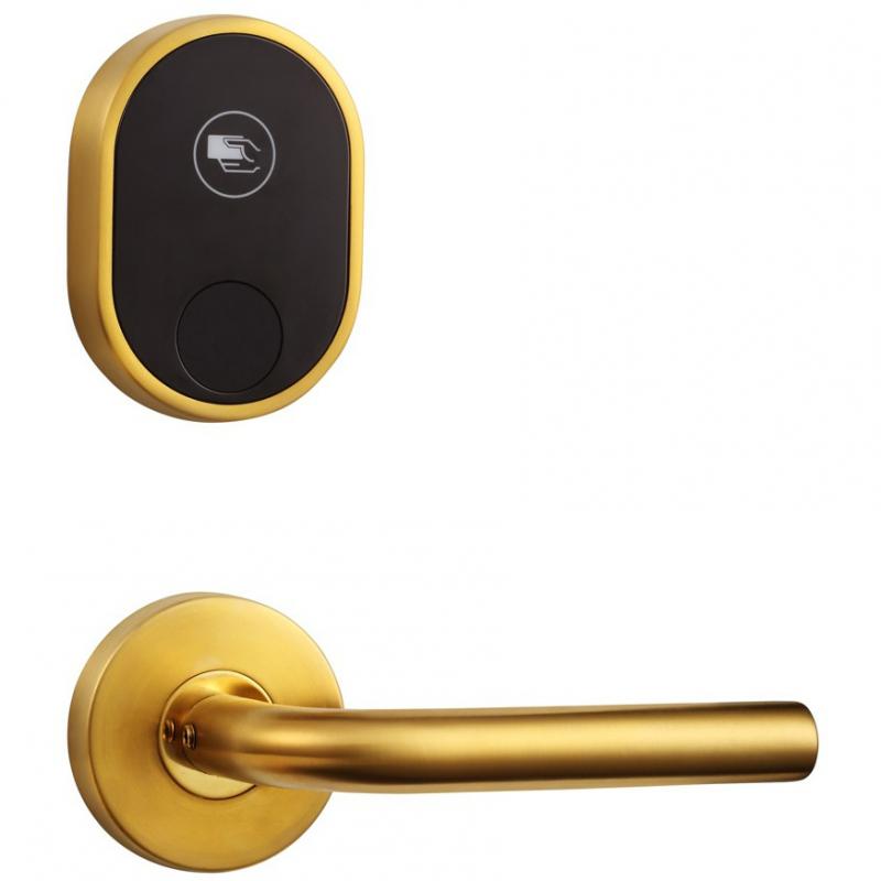 Автономный электронный замок для гостиницы из нержавеющей стали. Замок для гостиничной двери HSU-9902-G выполнен в золотом цвете, который подчеркивает высокий уровень отеля. Блок считывателя и блок ручек в данном электронном замке раздельные. В комплекте с замком имеются уплотнительные резинки под блок считывателя и батарейный отсек, ручки. Это обеспечивает дополнительную устойчивость к воде и пыли, позволяет производить установку электронного замка для гостиниц на уличных дверях. Раздельный дизайн замка смотрится естественно в отелях, желающих подчеркнуть свою современность.