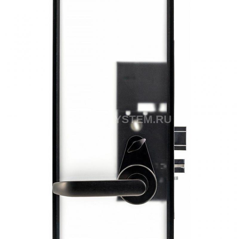 Электронный замок для гостиниц HSU-9905BT-TH с раздельными ручками и считывателем, который выполнен срытым. Черный матовый дизайн TH замков для гостиниц отлично смотрится на двери любой фактуры и цвета. Все электронные компоненты гостиничного замка HSU-9905BT-TH перенесены во врезной механизм: блок электроники, считыватель, батарейный отсек. Это с одной стороны позволило создать современный компактный вид, не загромождающий дизайн двери гостиничного номера. С другой стороны, создает законченное инженерное решение без кабелей коммутации батарейного отсека и считывателя*, облегчающее монтаж и дальнейшую эксплуатацию.