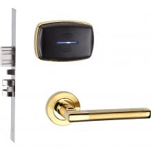 Раздельный дизайн замка. Питание - 6В (4 батарейки типа ААА). Материал корпуса - сталь AISI 304. Цвет - золото, способ нанесения покрытия - PVD. Материал врезного механизма - сталь AISI 304. Считыватель - Mifare. Сертификат соответствия ГОСТ Р.