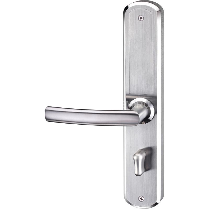 Электронный замок. Питание - 6В (4 батарейки типа АА). Материал корпуса - сталь AISI 304. Цвет - серебро, способ нанесения покрытия - PVD. Материал врезного механизма - сталь AISI 304. Усиливающее кольцо в основании ручки. Считыватель - Mifare. Возможность нанесения логотипа отеля на шильдике. Сертификат соответствия ГОСТ Р. Сертификат противопожарной безопасности.